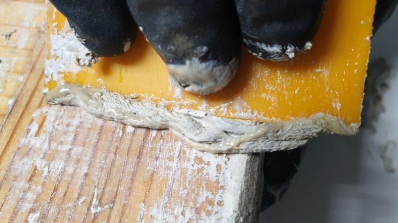 Удаляем покрытие шпателем. Поверхность получается не идеально чистой, однако большая часть покрытия снимается. Для удаления остатков наносим состав повторно и проходим шпателем еще раз.